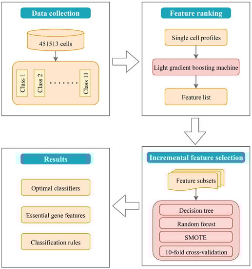 Flow chart of the study design. First, lightGBM method was applied to rank the features of single-cell gene expression profiles into a ranked list. Second, IFS method with machine learning algorithms was used to detect the best number of features and build the optimal classifiers and decision rules. Finally, functional enrichment analysis was performed on the optimal gene feature set.
