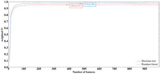 IFS curve of DT and RF methods. IFS curves were plotted, with the number of features as X-axis and the performance as Y-axis. The highest weighted F1 scores generated by RF and DT were marked.