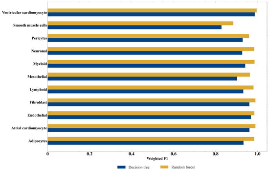 Although the optimal RF classifier exhibited quite good performance, it is a black-box classifier that fails to explain the decisions. To extract more insights for the study of heart cells, DT, a white-box algorithm, was employed. We conducted the same procedures on DT that had been done for RF. The performance of DT classifiers on different feature subsets is listed in Table S2. An IFS curve was also plotted, as shown in Figure 2. It can be observed that the highest weighted F1score was 0.957 when top 380 features were used. Thus, an optimum DT classifier can be built with these features. Other metrics of such classifier are provided in Table 3. The performance of such classifier on all cell types is shown in Figure 3. Evidently, the performance of the optimum DT classifier was lower than that of the optimum RF classifier, which conform to the general fact that RF is more powerful than DT. However, DT has its own merit that RF cannot have. The classification procedures of DT were completely open, which make us possible to understand its classification principle, thereby giving new insights to uncover the difference of heart cells in different types.