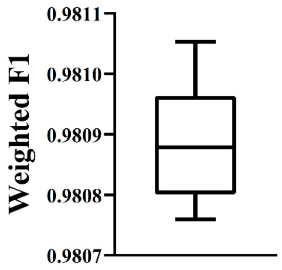 As mentioned above, the optimal RF classifier provided quite good performance. It can be an efficient tool to classify heart cells. To further elaborate its robustness, the following test was conducted. First, some noise was added to the dataset, in which cells were represented by features used in the optimal RF classifier. In detail, we randomly selected 10% cells. Each feature of these cells randomly increased or decreased by a small number. On such dataset, the optimal RF classifier was evaluated by 10-fold cross-validation. Above procedures were executed for ten times, producing ten weighted F1 scores. A box plot was drawn (Figure 4) to show these values. It can be observed that the performance on datasets with noise was almost same as that on the original dataset. This proved the robustness of the optimal RF classifier.