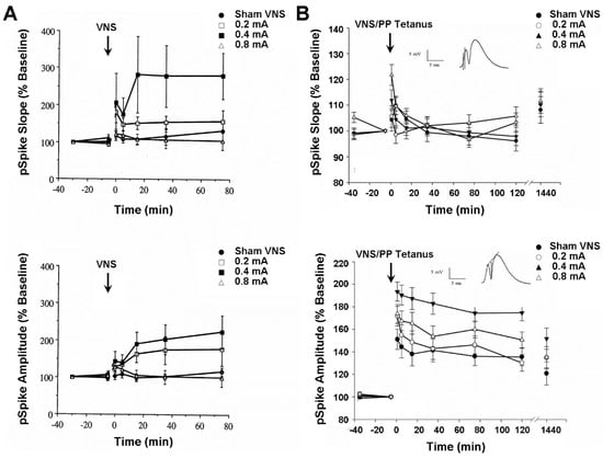 VNS-induced neuronal plasticity of the hippocampus, a brain area affected by spaceflight and important for cognitive-emotional restructuring. Activity from neuron population responses in anesthetized (panel (A), top and bottom displays) and awake, freely moving laboratory rodents (panel (B), top and bottom displays) were recorded from the dentate gyrus of the hippocampus before and after VNS at 0.2, 04, or 0.8 mA and 20 Hz for 30 s. Figure 2A and Figure 2B are reproduced, respectively, from [14,50] with permission.