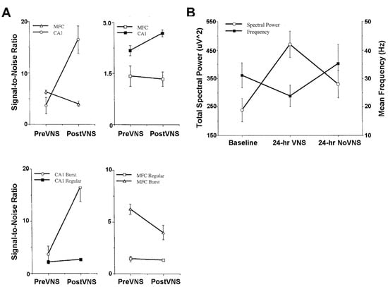 VNS-induced increases in the power of neuronal activity in corticolimbic structures affected by spaceflight and important for cognitive-emotional restructuring. VNS, delivered at 04 mA, 20 Hz for 30 s to anesthetized laboratory rodents, increases the signal-to-noise ratio of CA1 pyramidal (Burst) and inhibitory (Regular) neurons recoded from the hippocampus, while simultaneously decreasing the signal-to-noise ratio of infralimbic area pyramidal (Burst) and inhibitory (Regular) neurons recorded from the medial frontal cortex (MFC) (panel (A), left top and bottom displays compare respective pyramidal and inhibitory neuron output). Consistent with these findings, VNS administered for 24 h at therapy-relevant continuous intermittent parameters markedly increases the total spectral power and decreases the frequency of frontal cortex electroencephalogram activity recorded from awake, freely moving rats (panel (B). Figure 5A and Figure 5B, respectively, reproduced from [14,51] with permission.