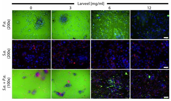 Fluorescence microscopy of cells infected with bacteria. Fibroblast and keratinocyte co-cultures were infected with P. aeruginosa and S. aureus in medium with 0.5% antibiotics and were supplemented with different Larveel® concentrations for 24 h. P. aeruginosa is shown in green fluorescence (gfp), S. aureus in red fluorescence (rfp) and nuclei of dermal cells are shown in blue (DAPI). Nuclei of keratinocytes were arranged in clusters. P.a.: P. aeruginosa; S.a.: S. aureus. Top and middle line 200× magnification, scale bar: 50 µm; bottom line 100× magnification, scale bar: 100 µm.