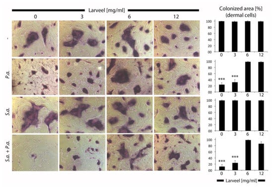 Gram staining of cells infected with bacteria. Fibroblast and keratinocyte co-cultures infected with P. aeruginosa and S. aureus in medium with 0.5% antibiotics and different Larveel® concentrations were stained 24 h after incubation. Pictures of dermal cells were taken (50× magnification) and number of pixels was quantified. P.a.: P. aeruginosa; S.a.: S. aureus. Colonized area by dermal cells without bacterial inoculation and Larveel® treatment was defined as 100%. Results of all experiments were given as mean ± SD. *** p < 0.001.