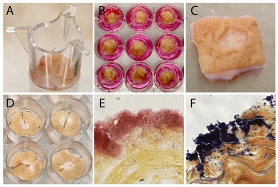 In order to analyze Larveel® treatment depending biofilm stability and for quantification of the effect of Larveel® on biofilm removal, an ex vivo human dermal wound model was established. Initially, ex vivo experiments were carried out as previously described [23] and were later modified. Human dermal tissue pieces cultivated in 12-well tissue culture plates in air–liquid interphase were biopsy punched in a standardized manner and infected for 24 h (Figure 3). Gram staining revealed reddish Gram-negative P. aeruginosa and deep purple Gram-positive S. aureus biofilms on the skin tissue (Figure 3E,F).