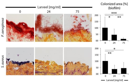 For wounding, skin was punched standardized 1 mm in depth using a 6 mm Ø biopsy punching knife. A punched piece was removed carefully by lifting it with forceps and cutting it off with scissors, without penetrating the skin tissue. Wound infection was performed by application of 10 µL of bacterial solution (OD600 = 1.0) on the wound, and at the same time, addition of 10 µL of the medium containing 48 or 150 mg/mL Larveel® and 1% antibiotics to obtain a final concentration of 24 or 75 mg/mL Larveel® and 0.5% antibiotics. For control, 10 µL of the medium without Larveel® but with antibiotics was used. Again, samples were cultured at 37 °C in a humidified atmosphere containing 5% CO2 for 24 h. Afterwards, to remove unstable fragments of biofilms, samples were washed in a standardized manner with defined volume (P. aeruginosa: 500 µL, S. aureus: 100 µL) of PBS application once before samples were fixed with 4% paraformaldehyde (PFA) at 4 °C overnight. Accordingly, after washing three times with PBS, samples were incubated in 10% saccharose at 4 °C overnight before preparing frozen sections. Sections were Gram stained according to standard protocols. Pictures were taken and the number of pixels of biofilms was quantified using the software Photoshop as described. The biofilm area without Larveel® treatment was defined as 100%. All experiments were repeated seven times. Results of all experiments were given as mean ± SD.