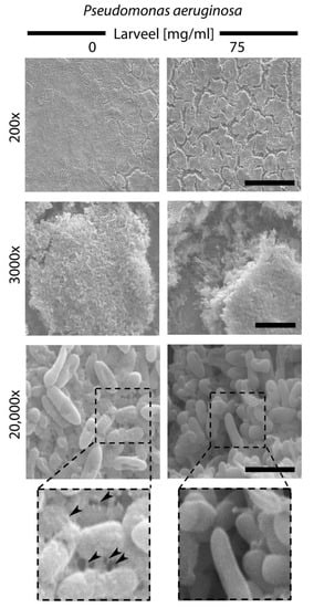 SEM analyses of P. aeruginosa biofilm surface. Biofilm production and maturation was performed for 48 h with and without Larveel® treatment. Cracks were observable on the surface of biofilms of treated P. aeruginosa (top). Filament-like extracellular matrix structures on the surface of untreated bacteria are indicated by arrowheads (down; box: enlarged sections). Scale bars: 200×: 200 µm; 3000×: 10 µm; 20,000×: 2 µm.