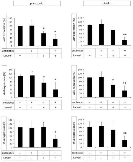 Gene expression of biofilm maturation and virulence genes measured by qRT-PCR after treatment with antibiotics (0.25%) or/and Larveel® (24 mg/mL). Gene expression without antibiotics and Larveel® was defined as 100%. Results of all experiments were given as mean ± SD. (* p < 0.05, ** p < 0.01).