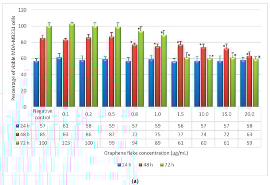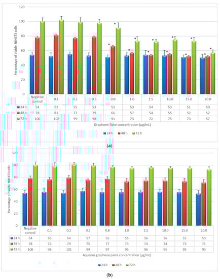 Percentage of viable NIH3T3 cells as a function of incubation time (24, 48, and 72 h) and sample concentration, as determined by the neutral red uptake: (a) NIH3T3 + graphene flake; (b) NIH3T3 + aqueous graphene paste. Data are mean ± SD of three experiments run in six replicates. * Values are statistically different versus negative control (complete medium), p < 0.05.