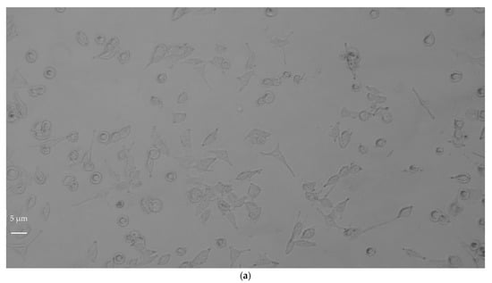 Optical microscopy images of NIH3T3 cells after 24 h of incubation with: (a) GF 10 µg/mL; (b) AGP 20 µg/mL. Magnification 20×, scale bar = 5 µm.