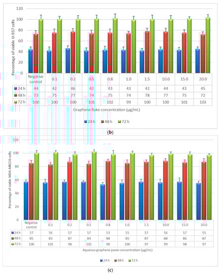 In this regard, this study aimed to investigate the degree of in vitro biocompatibility, in terms of cytotoxicity and mutagenicity, of multilayer commercial-grade ultrapure, defect-free, un-oxidized and highly ordered, highly crystalline graphene flakes (GFs) and their stable dispersion, aqueous graphene paste (AGP), in order to assess their possible application as biomaterials. The novelty of this paper is due to the procedures used for the evaluation of in vitro cytotoxicity and genotoxicity. In fact, the experiments reported were performed following the International Standard ISO 10993 (Biological evaluation of medical devices), whose primary aim is the protection of humans from potential biological risks arising from the use of medical devices [20]. Finally, the antitumoral activity of both GF and AGP towards adherent cells and cells in suspension, namely, human breast adenocarcinoma cells (MDA-MB-231) and human monocytes from histiocytic lymphoma (U-937), was also investigated.