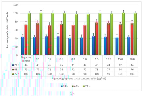 Percentage of viable MDA-MB-231 and U-937 as a function of incubation time (24, 48, and 72 h) and sample concentration, as determined by the neutral red uptake assay: (a) MDA-MB-231 + graphene flake; (b) U-937 + graphene flake; (c) MDI-MB-231 + aqueous graphene paste; (d) U-937 + aqueous graphene paste. Data are mean ± SD of three experiments run in six replicates. * Values are statistically different versus negative control (complete medium), p < 0.05.