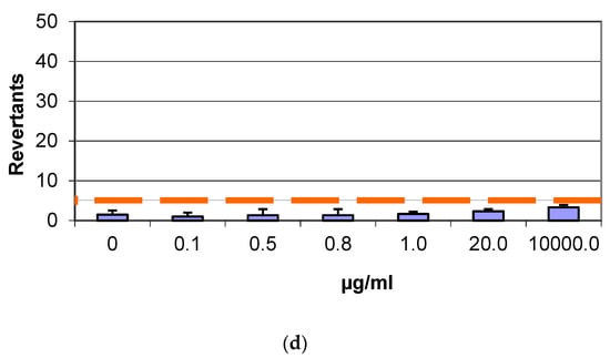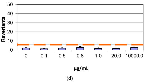 Number of revertants in TA98 S. typhimurium strain exposed to different concentrations of (a) GF without S9 fraction; (b) GF with S9 fraction; (c) AGP without S9 fraction; (d) AGP with S9 fraction. The results are reported as the mean of revertants ± SD, p < 0.05.