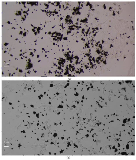 AGP and GF at 20 µg/mL and 10 µg/mL respectively possessed the same graphene concentration but differently influenced cell viability, as shown in Figure 1. In particular, the percentage of viable fibroblasts decreased for incubation times of 48 and 72 h in the presence of GF but not with AGP. This different behavior between the two graphene samples may have been due to the different size and morphology of graphene aggregates. As shown in Table 3 and Figure 6a, GF at a concentration of 10 µg/mL showed larger aggregates (66% with dimensions of about 10 µm x 4.5 µm) in comparison to AGP at 20 µg/mL (63% with dimensions of 1.4 µm x 0.9 µm). This trend agrees with observations reported by Ren et al. [29] regarding VSMCs growth, which was stimulated by smaller flakes, but disagrees with the observation of Wychowaniec et al. [30] which demonstrated a higher cytotoxicity of smaller GO flakes.