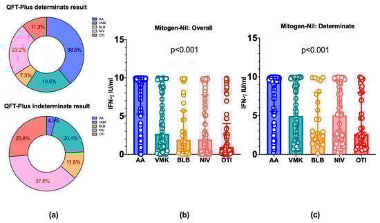 QFT-Plus indeterminate results and IFN-γ production in COVID-19 patients stratified according to the maximal oxygen supply needed during hospitalization. (a) Rates of determinate and indeterminate results at the QFT-Plus assay in COVID-19 patients stratified according to the maximal oxygen support needed during the entire hospitalization are represented. (b) The levels of IFN-γ in the Mitogen-Nil condition of the QFT-Plus assay in COVID-19 patients stratified according to the maximal oxygen support received during the entire hospitalization are represented. (c) As in (b), after removing COVID-19 patients with an indeterminate result of the QFT-Plus Assay. The histogram height represents the median value. Whiskers represent the interquartile range. QFT-Plus: QuantiFERON-TB Gold Plus; IFN-γ: interferon-γ; AA: ambient air; VMK: Venturi oxygen mask; NRM: Non-Rebreather Mask; NIV: non-invasive ventilation; OTI: orotracheal intubation for mechanical ventilation.