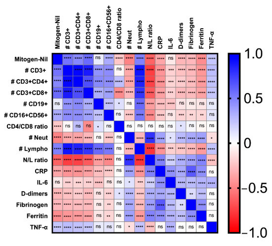 The levels of IFN-γ in the Mitogen-Nil condition were positively correlated with total lymphocyte absolute counts, total CD3+, CD3+CD4+, CD3+CD8+, CD3negCD16+CD56+ absolute counts, and TNF-α plasmatic levels (Spearman’s test p < 0.0001 for all the correlations). An inverse correlation between IFN-γ levels in the Mitogen-Nil condition and CD4/CD8 ratio, neutrophil counts, N/L ratio, CRP, D-dimers, fibrinogen and ferritin was also found (Spearman’s test p < 0.0001 for all the correlations) (Figure 2).
