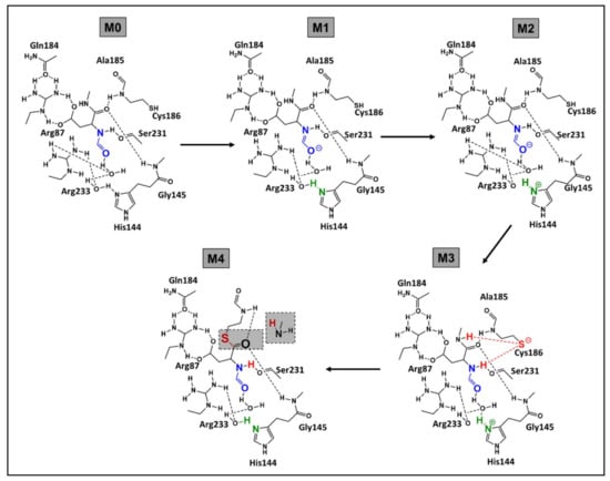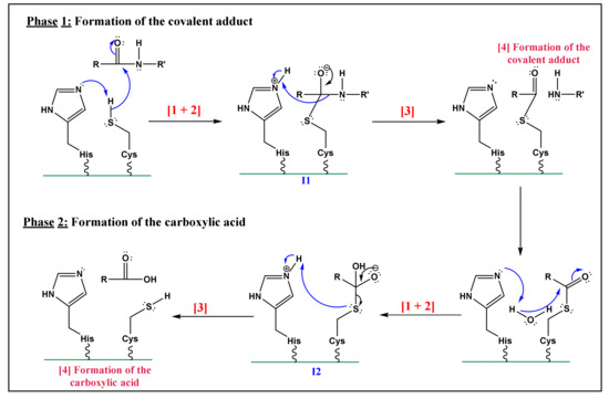 - Thiolate nucleophilic attack on carbonyl: the carbonyl group of the aspartic peptide bond undergoes a nucleophilic attack by the yielded thiolate in the latter step. This contributes to the formation of a first tetrahedral intermediate (I1; Figure 5).