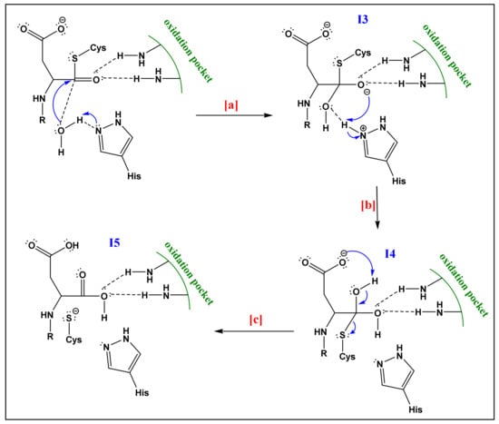 - The carboxylate function of the side-chain aspartate will attack one of the hydrogens of the diol. The thiol, acting as a good leaving group, will enhance the possibility of the formation of a carbonyl bond; thereby a carboxylic acid and a thiolate (I5; Figure 6). The computational investigation shows that for the attack of the water molecule, a free energy barrier of about 19 ± 4 kcal/mol must be overcome, these trends are following the experimental results of Sulpizi et al. [88].