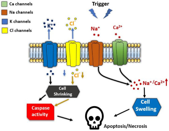 - Kunzelmann, K. Ion Channels in Regulated Cell Death. Cell. Mol. Life Sci. 2016, 73, 2387–2403. [Google Scholar] [CrossRef]