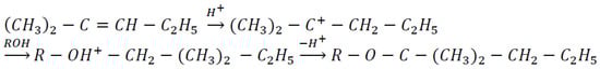 An example of an acid-catalyzed reaction of 2-methyl pent-2-ene with alcohol to 2-methyl-2-alkoxy pentane over Al-montmorillonite catalyst.