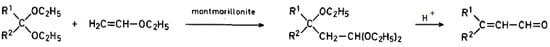 Clay-catalyzed reaction of acetals with enol ethers to produce precursors of α,β-unsaturated aldehydes. R1 = C6H5, CH3, C2H5, n-C6H13, or -(CH2)5-; R2 = H or -(CH2)5-.