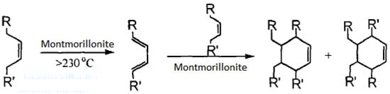 Adsorption on the different surfaces of a clay mineral lowers the dimensionality of the reaction space from 3 to 2. This restriction results in greatly enhanced reaction rates. Several Diels–Alder cycloadditions are catalyzed by Lewis acids and are sensitive to clay mineral catalysts [,,,] (Scheme 5).