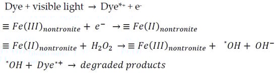 The traditional photo-Fenton reaction is frequently adversely affected by the constraints of operating conditions such as pH, low Fe concentration, the amount of ultraviolet light available in sunlight, and the instability of Fe-based catalysts. Liu et al. [] published a new heterogeneous Fenton reaction using a dye-photosensitized structural Fe(III)/Fe(II) redox cycling method. Synthetic nontronite showed good catalytic activity over a pH range between 3.0 and –8.0 for the extremely effective breakdown of Rhodamine B by H2O2 using irradiation with visible light. The excited dye molecule acted as a donor of electrons to structural Fe present in the nontronite, which then catalyzed H2O2 to form very reactive *OH radicals (Scheme 9).