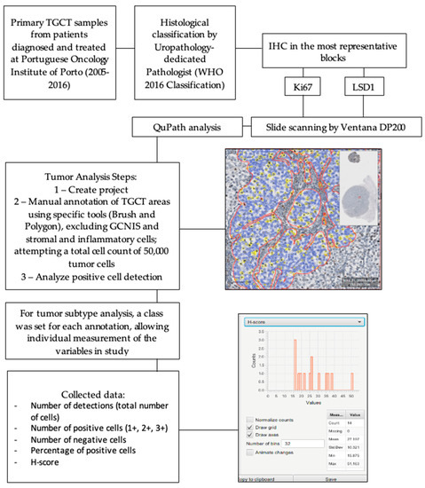 Importantly, to improve the robustness of our results compared to previous studies, the immunoexpression of Ki67 and LSD1 was assessed using a digital image analysis system (QuPath, Version 0.2.3, QuPath developers, The University of Edinburgh, Scotland) for nuclear immunostaining quantification, after proper scanning, performed by VENTANA DP200 system. The detailed QuPath assessment and study protocol is represented in Figure 1. Briefly, QuPath integrated tools were used for area selection within the tumor, excluding GCNIS, stromal, and inflammatory cells. The manual selection tools allowed for clear “cell-by-cell” separation of highly intricated tumor components such as EC and YST, and accurate elimination of non-tumor cells. A total cell count of 50,000 tumor cells was attempted for every tumor sample. Within each selected area, positive cell analysis was conducted. Briefly, after setting nuclear, cell, and analysis parameters, including positive intensity threshold, the software automatically attributed expression score annotations to every cell (blue for no expression, yellow for low expression (+1), orange for moderate (+2), and red for high expression (+3)). From the annotation analysis results, the number of detected cells, number of positive detected cells (+1, +2, and +3), number of negative cells, positive cell percentage, and H-score (product of positive nuclei per each intensity score) were collected.