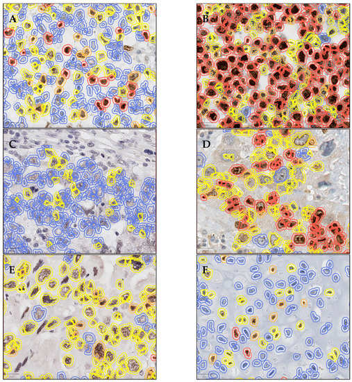 Illustrative examples of Ki67 and LSD1 immunoexpression across different testicular germ cell tumor subtypes, obtained through QuPath software with 40× magnification: (A). Case of pure SE, with Ki67 immunostaining; (B,C). Two cases of pure EC, with Ki67 and LSD1 immunostaining, respectively. Notice the several immune cells and stromal cells that were eliminated from the quantification; (D,E). CH components from the same mixed tumor case, with Ki67 and LSD1 immunostaining, respectively. Some cells are left uncounted for better appreciation of the nuclear DAB staining. (F). TE component of a mixed tumor case, with Ki67. The colors represent the intensity of expression (blue—no expression, yellow—low, orange—moderate, and red—high expression). Scale bars are presented for each photograph in the lower left corner.