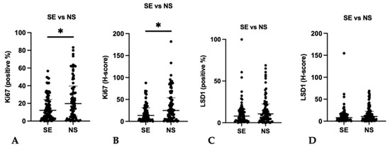 Immunoexpression in Seminomas and Non-seminomas. (A,B). SE versus NS; A. Ki67 positive %; (B). Ki67 H-score. (C,D). SE versus NS; C. LSD1 positive %; (D). LSD1 H-score. Median and interquartile range are presented. * p < 0.05. NS, Non-seminoma; SE, Seminoma.