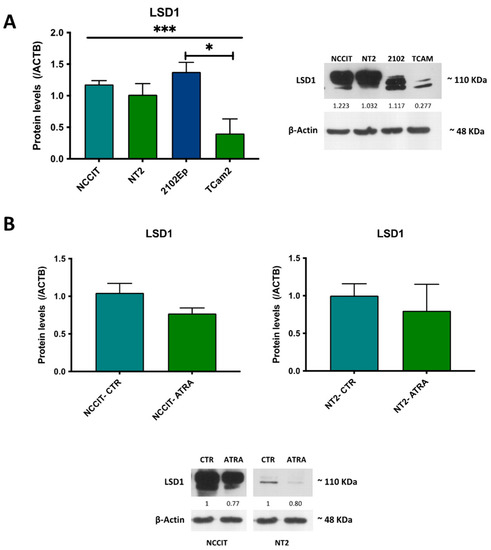 LSD1 protein expression in TGCT cell lines. (A)—All cell lines; (B)—NCCIT versus differentiated NCCT (ATRA-treated) and NT2 versus differentiated NT2 (ATRA-treated). Results are normalized to ACTB (and to vehicle/control in (B)). Abbreviations: CTR—control. Representative bands and densitometric readings are presented as assessed by ImageJ software. Non-parametric tests were used (Kruskal–Wallis and Mann–Whitney U-test, as appropriate). * p < 0.05, *** p < 0.01.