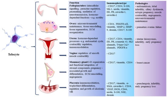 The female reproductive organs form a highly complex and intricately connected system with many peculiarities unlike any other when we consider other organ systems of the mammalian body. The most astonishing feature of the female reproductive system (FRS) is its capability to induce immune tolerance towards the hemiallogenic embryo. Although this characteristic has been evolutionarily conserved for tens of millions of years, we still do not fully understand it, despite the fact that over the last few decades, the knowledge of the morphology, physiology, and pathophysiology of the FRS has been growing exponentially [1,2]. The FRS’s main task is to ensure the successful development of an embryo/fetus with the ultimate goal of species preservation. In order to fulfill this goal, all the organs belonging to the FRS must work in highly regulated cooperation and synchrony [3]. If any of the components fail to operate properly, various pathological conditions may occur. One of the most significant, which has become a global problem, especially in developed countries, is female-factor infertility [4]. Another clinically important issue is the proneness of some FRS organs to cancerogenesis [5]. The most challenging aspect is that the exact mechanisms by which many of these conditions occur are largely unknown. However, there is one cell population that may be a game-changer in understanding the intricate functioning of the system as a whole—telocytes (TCs) [6].