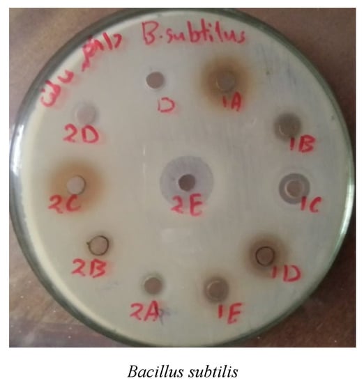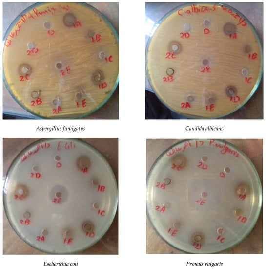 The following microorganisms were obtained from Al-Azhar University, Faculty of Science: gram-positive bacteria (Bacillus subtilis), gram-negative bacteria (Escherichia coli and Proteus vulgaris), and fungal strains (Aspergillus fumigatus and Candida albicans). The bacterial and fungal strains were cultured in nutrient agar and malt extract, respectively.
