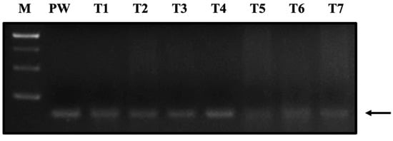 Evaluation of the interference of different tissues of juvenile shrimp on the amplification of WSSV pathogenic genes. A DirectGO direct PCR kit was the tested reagent. A 140 bp PCR amplification product of the VP28 gene was generated using the WSSV primer pair and 250 copies of standard DNA plasmid (pUC57-VP28). M: DNA marker; PW: ddH2O; T1: pereiopods; T2: pleopods; T3: gill; T4: hemolymph; T5: hepatopancreas; T6: stomach; and T7: midgut.