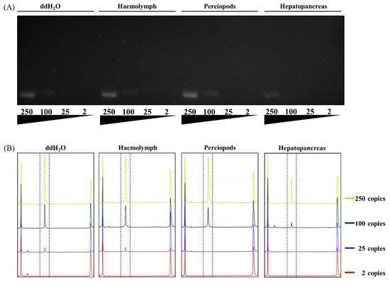 Detection limit comparison in the presence of hemolymph, pereiopod, or hepatopancreatic lysate. Direct PCR products were analyzed by (A) agarose gel electrophoresis and (B) capillary electrophoresis. The 140 bp PCR amplification product of the VP28 gene was generated using the WSSV primer pair and 2–250 copies of standard DNA plasmid.