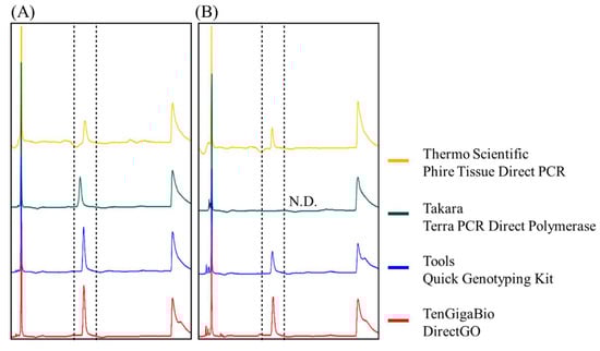 Direct PCR kits used in this study were purchased from four different biotech companies: DirectGO (Ten Giga Bio, New Taipei, Taiwan), Quick Genotyping Kit (BioTools Co. Ltd., New Taipei, Taiwan), Terra PCR Direct Polymerase (Takara Bio Inc., Tokyo, Japan), and Phire Tissue Direct PCR (Thermo Fisher Scientific, Hudson, NH, USA). A Qsep1 portable capillary electrophoresis and an S2 cartridge CE column were purchased from BiOptic (New Taipei, Taiwan).