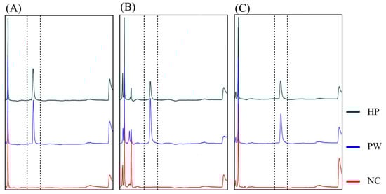 Detection of WSD, AHPND, and HPM pathogens using direct a PCR-based capillary electrophoresis platform. (A) WSD, (B) HPM, and (C) AHPND. HP: analysis of direct PCR products in the presence of hepatopancreatic lysates; PW: control group, absence of hepatopancreatic lysate; NC: negative control, absence of hepatopancreatic lysate and DNA polymerase. The PCR template was 250 copies of standard DNA plasmid.