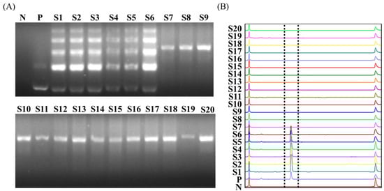 Considering the disadvantages of analyzing PCR products with agarose gel-based electrophoresis, which include a higher detection limit (~5 ng DNA), longer analysis time, and more complex manual manipulation, we attempted to replace it with a portable capillary electrophoresis (CE) analyzer that offers better detection sensitivity and ease of operation. The results showed that, for the same sample, the sensitivity of the CE platform was more than four times higher than that of agarose gel-based electrophoresis (Figure 2B), and the entire analysis process took only 3 min.
