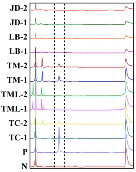Pathogen detection of EHP in single post larva shrimp samples using direct PCR-based capillary electrophoresis. N: negative control, reaction absence of DNA polymerase; P: positive control, replacement of shrimp lysate with standard plasmids in the reaction. TC: Toucheng; TML: Taimali; TM: Taimu; LB: Linbian; and JG: Jiadong.