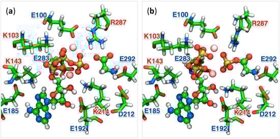 The three-dimensional structure of PurD has been determined in several organisms. In this study, we investigated the catalytic activity of PurD from Aquifex aeolicus, a thermophilic bacterium that is thought to be one of the oldest species of bacteria. We focused on the phosphorylation of glycine, as shown in Figure 1, which is the first step of the GAR biosynthetic reaction to produce the glycyl-phosphate intermediate. PurD binds to four substrate molecules involved in the reaction: ATP, two Mg2+ ions, and glycine. The initial structure of PurD was obtained from the X-ray crystal structure of Aquifex aeolicus PurD in an ATP-bound form (PDB ID: 2YW2) [], after the removal of the crystallographic water molecules. Two crystal structures (PDB IDs: 2YW2 and 2YYA) of Aquifex aeolicus PurD have been deposited in PDB by two of the authors. In this study, we selected the ATP-bound structure, 2YW2, as the initial structure. No structure that is exactly equivalent to the initial and final states of the reaction has been identified. However, a few structures with parts of the substrates bound to PurD have been determined. Thus, plausible structures of the PurD complex with substrates for the initial and final states of the reaction were prepared according to the analyses reported by Sampei et al. [].