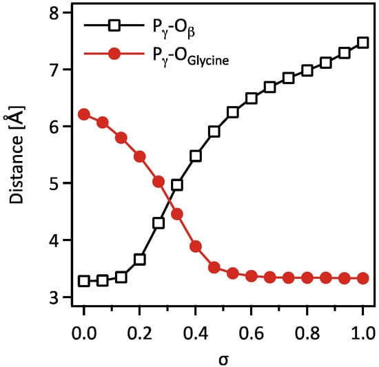 Changes in the interatomic distances between the phosphorus (P) and oxygen (O) atoms at the γ- and β-positions of ATP, Pγ-Oβ, and at the carbonyl group of glycine, Pγ-Oglycine, along the minimum energy path.
