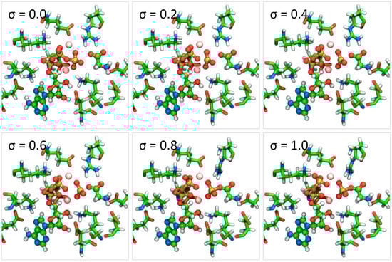 The MEP of the catalytic reaction in PurD was determined using the string method combined with the QM/MM approach, which connects the initial and final states, as shown in Figure 2. Figure 3 shows the changes in the interatomic distance between the phosphorus and oxygen atoms at the γ- and β-positions of ATP, Pγ-Oβ, and the distance between the phosphorus and oxygen atoms at the carbonyl group of glycine, Pγ-Oglycine. The reaction coordinate parameter σ represents the degree of conformational changes of the substrate molecules (ATP4−, two Mg2+ ions, and glycine) along the MEP, which is normalized to zero at the initial state and one at the final state. In Figure 3, the distances were plotted against σ, which gives a detailed account of the structural changes during the reaction, indicating the hydrolysis of the γ-phosphate of ATP and the phosphorylation of glycine. Figure 4 shows the conformational changes of the substrates and its neighboring amino acid residues of PurD at six points (σ = 0.0–1.0) on the MEP, where a phosphoryl transfers from ATP to an adjacent glycine, yielding a glycyl-phosphate and ADP.