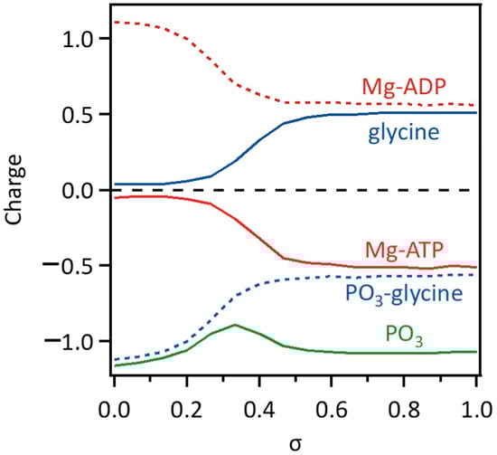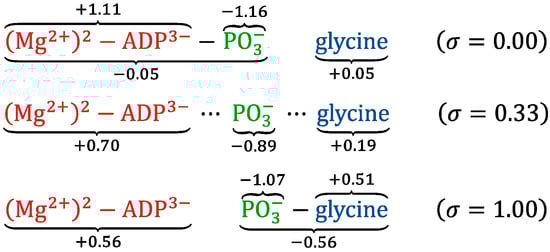 As shown in Figure 6, the overall tendency of the distribution of partial atomic charges clearly changed from σ = 0.2 to 0.5. The glycine moiety is almost neutral at the initial state of the reaction; after σ = 0.2, the closer the phosphate gets to the glycine, the larger its increase in the partial charge; then it reached +0.50 at σ = 0.6, where glycyl-phosphate was produced. The calculated partial charge of the glycyl-phosphate moiety was −0.56 at the end of the reaction, although the formal charge of glycyl-phosphate was −1. The Mg-ATP moiety was also almost neutral initially; however, after σ = 0.2, its partial charge decreased and reached −0.49 at σ = 0.6, where ATP was hydrolyzed. The calculated partial charge of the Mg-ADP moiety was +0.56 at the end, although the formal charge was +1. The partial charge of the phosphate moiety was −1.16 at the initial state, and its value, −1.07, at the end almost remained unchanged. However, it showed a small peak of −0.89 at σ = 0.33 during the reaction, where the partial charges of the Mg-ADP and glycine moieties were +0.70 and +0.19, respectively.