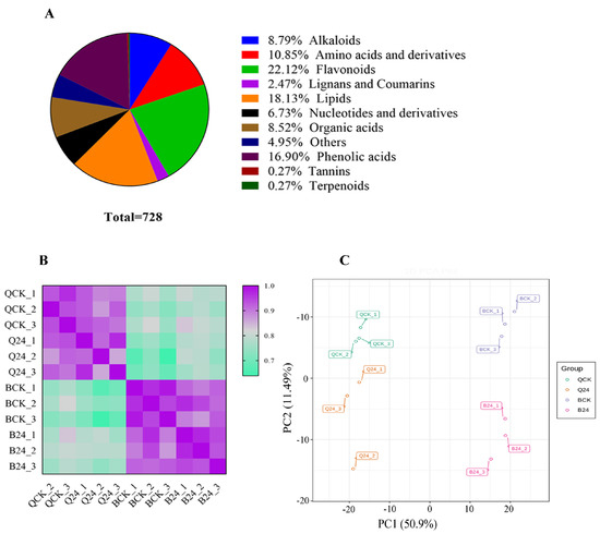 Metabolome quality control and description (A) Major classes of identified metabolites (728) and their corresponding percentage (B) correlation matrix for metabolites identified in leaf tissues of B144 and Q319 inbred maize lines (C) Principal component analysis for metabolites identified in leaf tissues of B144 and Q319 inbred maize lines. * QCK: Q319 control; Q24: Q319 cold stress; BCK: B144 control; B24: B144 cold stress.