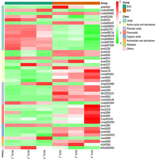 Differential accumulation of metabolites in B144 (cold tolerant maize inbred line). Heatmap representing accumulation profile of DAMs under control (BCK) and cold-stress (B24).