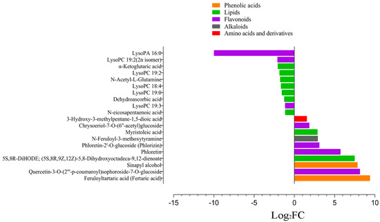 Maize is a thermophilic plant; therefore, it is pertinent to understand and exploit changes associated with cold stress at the early growth stage. To serve the purpose, we exposed a cold-tolerant maize inbred line B144 to cold stress and compared its metabolome with the control. Comparing the metabolites ion intensity in the tolerant line between control and stress conditions yielded a total of 45 differentially accumulated metabolites (DAM) (Figure 2 and Table S2). Among these DAMs, 27 metabolites were up-accumulated, while 18 metabolites were down-accumulated under cold stress. Feruloyltartaric acid (Fertaric acid), Quercetin-3-O-(2″′-p-coumaroyl)sophoroside-7-O-glucoside, Sinapyl alcohol, 5S,8R-DiHODE; (5S,8R,9Z,12Z)-5,8-Dihydroxyoctadeca-9,12-dienoate, Phloretin, Phloretin-2′-O-glucoside (Phlorizin), N-Feruloyl-3-methoxytyramine, Myristoleic acid, Chrysoeriol-7-O-(6″-acetyl)glucoside, and 3-Hydroxy-3-methylpentane-1,5-dioic acid were identified as top 10 up-accumulated metabolites (Figure 2). In contrast, most of the lipids showed down-accumulation under induced cold stress, including N-(2-Hydroxyethyl)eicosapentaenoic acid, LysoPC 19:3, LysoPC 19:0, LysoPC 18:4, LysoPC 19:2, LysoPC 19:2(2n isomer), and LysoPA 16:0 (Figure 3). Further, we identified associated KEGG pathways for DAMs in B144. A significant proportion was associated with metabolic pathways (62.71%), followed by biosynthesis of secondary metabolites (52.94%), biosynthesis of amino acids (23.53%), arginine biosynthesis (17.65%), and purine metabolism (17.65%) (Figure S1A). The association of identified pathways depicted a significant role of these pathways under cold stress.