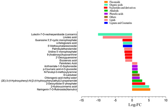Similarly, cold susceptible inbred line Q319 was also characterized for differential accumulation of metabolites under induced cold stress environment. Fifty-three metabolites were identified as differentially accumulated under cold stress treatment in Q319 (Figure 4 and Table S3). Among them, 22 DAMs were up-accumulated, while 31 DAMs were down-accumulated under cold stress. Naringenin-7-O-Rutinoside(Narirutin), 2-Hydroxycinnamic acid, 2-Deoxyribose-5′-phosphate, (2E)-3-(4-Hydroxyphenyl)-N-[2-(4-hydroxyphenyl)ethyl]-2-propenamide, Chlorogenic acid methyl ester, D-Lactulose, N-Feruloyl-3-methoxytyramine, p-Coumaric acid-4-O-glucoside, Anthranilate-1-O-Sophoroside, and Palmitoleic acid showed up-accumulation in Q319 under cold stress (Figure 5). While, nucleotides and derivatives viz., 2′-Deoxyguanosine, 9-(Arabinosyl)hypoxanthine, Uridine 5’-monophosphate, Guanosine 3′,5′-cyclic monophosphate, Lipids viz., Palmitoylethanolamide, Eicosenoic acid, and Linoleic acid depicted down-accumulation under cold stress (Figure 5). Major KEGG pathways associated with DAMs in Q319 under cold stress were metabolic pathways, biosynthesis of secondary metabolites, purine metabolism, and pyrimidine metabolism (Figure S1B).