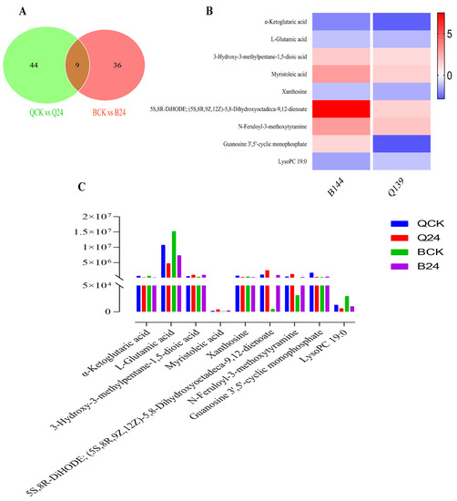 Venn diagram representing common DAMs between different comparisons (A) Venn diagram representing common DAMs between BCK vs. B24, and QCK vs. Q24 (B) heatmap representing accumulation pattern of conserved DAMs between QCK vs. BCK and Q24 vs. B24 (C) Ion intensity of conserved DAMs in QCK, Q24, BCK, and B24. The y axis represents the ion intensity. * QCK: B144 control; B24: B144 cold stress; QCK: Q319 control; Q24: Q319 cold stress.