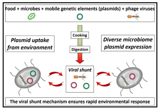 In the environment of enclosed microbial colonies, phage attack leaves debris in a form that can quickly be reassembled into new entities [39]. This process was first observed in the sea, trapping carbon in the upper layers of the ocean, and was described as a viral shunt [40]. Uptake of mobile genetic elements by transformation has been described as being facilitated by “superspreader” bacteriophages [41]. In this way, microbiota update their toolkit, incorporating novel abilities, such as antibiotic resistance, for example. Presumably, the ability to digest seaweed glycans amongst Japanese people came about by the same “extrinsic enzyme-updating” mechanism [42]. As stated above, the greater the diversity found within the microbiome, the healthier the population, as exemplified by the Hadza [35]. Although surprising at first sight, given the tendency for evolutionary processes to pare away anything not strictly necessary for survival, it is possible that this diversity enables the flexibility necessary for continued operation in changing circumstances (Figure 1).