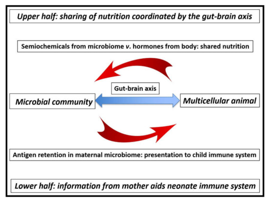 Figure 2 illustrates the ideal host/guest relationship, in which nutrition is partitioned on the one hand (top half) and the microbiome supplies the neonate with immune-system information on the other (bottom half). When fully functioning, the relationship is seamless, and the microbiome is effectively invisible [33].